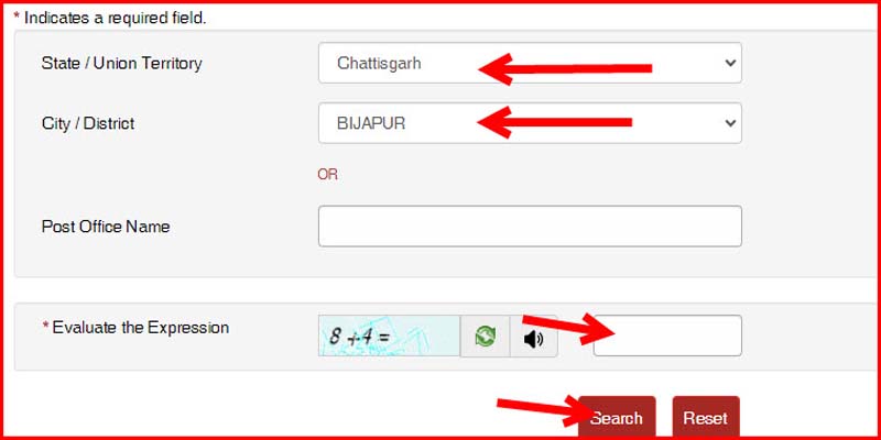 यदि आप राज्य और जिला के माध्यम से पिन कोड सर्च नहीं करना चाहते उसे स्थिति में इसके नीचे आपको पोस्ट ऑफिस नाम का ऑप्शन दिखाई देगा यहां पर आपको पोस्ट ऑफिस का नाम दर्ज करना है फिर कैप्चर कोड फिल्टर search पर क्लिक करना है।